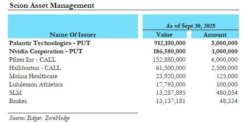 随后更耐人寻味的事情发生了:伯里执掌的Scion资产管理公司提前两周披露了其三季度的13F报告——报告显示,伯里不仅看到了泡沫,而且正在采取行动。
