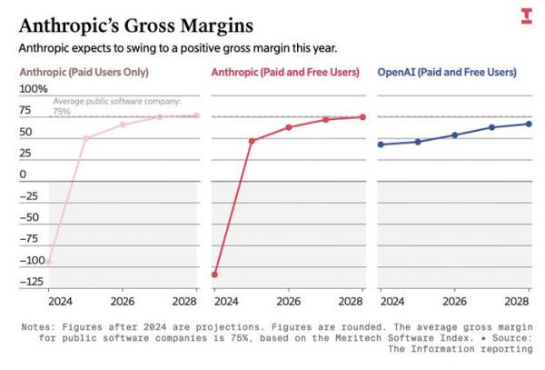 ▲Anthropic毛利率预计今年由负转正(图源:The Information)通常,业内高效的企业级软件初创公司,其毛利率标准为70%及以上,Anthropic将于2028年实现这一标准。