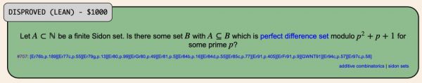 这道问题关乎组合数学中的Sidon集合与完美差集的关系——听上去高深莫测,但简单来说,Erdős猜想任何一个特殊的「Sidon数集」都能扩充成某种「完美差集」。