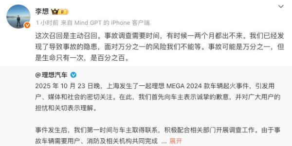 就在召回公告发布前一周(10月23日晚),上海发生了一起理想MEGA 2024款车辆起火事件,成为了此次召回的直接诱因。