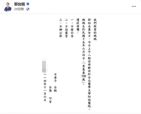 富商郭台铭于11月6日在社交软件发布母亲去世的讯息,据悉,郭台铭母亲于11月6日上午8点去世,享嵩寿100岁。