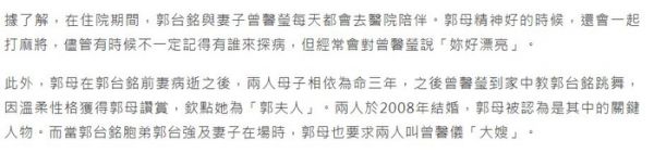 据台媒报道,郭母身体不佳,约五年不断进出医院,先在台北荣总治疗,后因离家远转至台北医学大学附属医院。住院时,郭台铭与曾馨莹每日陪伴,郭母精神好会一起打麻将,还常夸曾馨莹“你好漂亮”。郭台铭前妻病逝后,母子相依三年,曾馨莹获郭母认可钦点为“郭夫人”,2008年二人成婚,婚姻美满幸福。