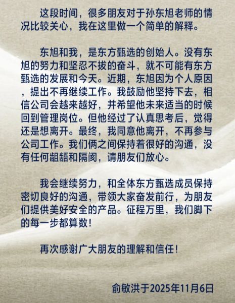 11 月 6 日消息,俞敏洪官宣孙东旭已离职。
