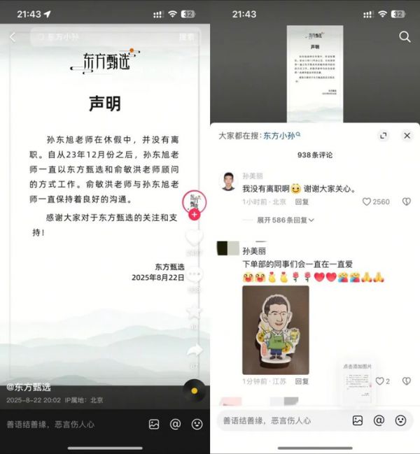 突发!孙东旭已从东方甄选离职,董宇辉“小作文”影响仍未消除?