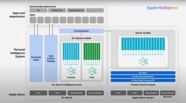 今年 7 月,苹果机器学习研究团队发布了一份技术报告,披露了苹果的两类自研模型。首先就是那套约 30 亿参数的端侧模型,针对 KV-cache 共享、量化感知训练等进行了优化;其次就是去年底就透露出的百亿级参数云端大模型,采用了目前主流的 Mixture of Experts(MoE)架构,计划将多专家路径与苹果的 PCC 私有云计算服务器深度结合,以提升推理效率与隐私安全。