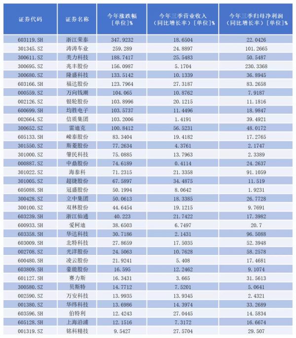 据览富财经统计,今年前三季度实现营业收入、归母净利润均同比增长,且截止10月31日收盘年内股价出现上涨的有32家上市公司。