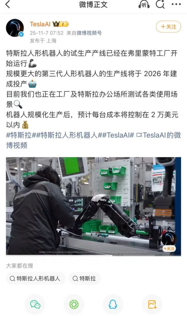 11月7日,特斯拉在其官方微博宣布,其人形机器人的试生产产线已经在弗里蒙特工厂开始运行,规模更大的第三代人形机器人的生产线将于2026年建成投产。目前公司也正在工厂及特斯拉办公场所测试各类使用场景,机器人规模化生产后,预计每台成本将控制在2万美元以内。