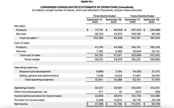 据苹果刚刚披露的2025财年第四季度财报显示,本季总营收达1024.66亿美元,同比增长7.9%;净利润实现274.66亿美元,同比大幅增长86.4%。