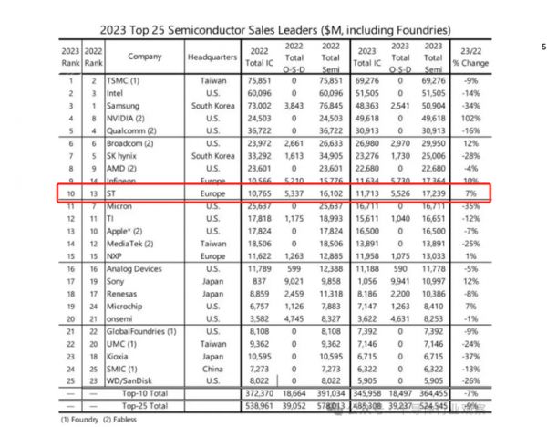 它也是全球第10大半导体厂商(2023年的数据),在全球汽车半导体市场上排名第3。