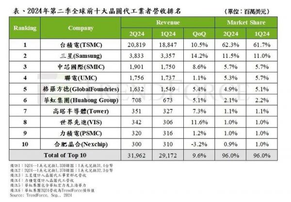 在2024年第二季度,全球十大芯片代工厂,中国已经有三家:中芯国际第三,华虹第六,晶合第十!
