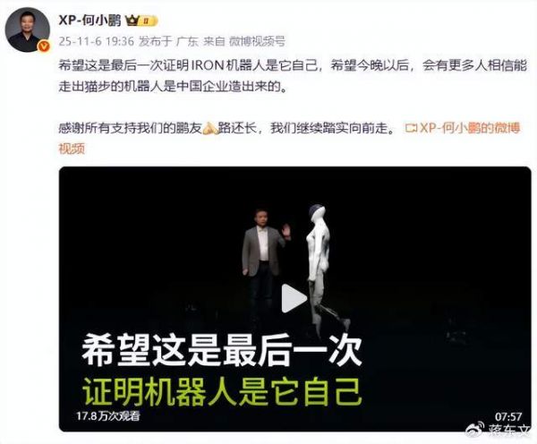 何小鹏:希望这是最后一次证明机器人是它自己,未来会证明机器人的“自证”,是有价值的,是会推动整个机器人行业蓬勃健康向前发展的。