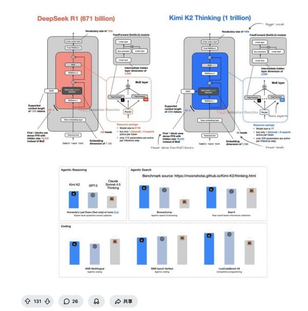 Raschka的分析指出了一个关键事实,Kimi K2 Thinking对DeepSeek核心架构的“继承”是显而易见的,包括MoE机制、MLA(多头潜在注意力)等设计。这是在一个已被验证的基座上,根据自身的目标进行了针对性的调整和优化。例如,减少注意力头和激活参数量,旨在降低推理成本;而增加专家数量和词汇表,则是为了增强模型的知识容量和表达能力。这种“站在巨人肩膀上”的做法,是开源精神最直接的体现。