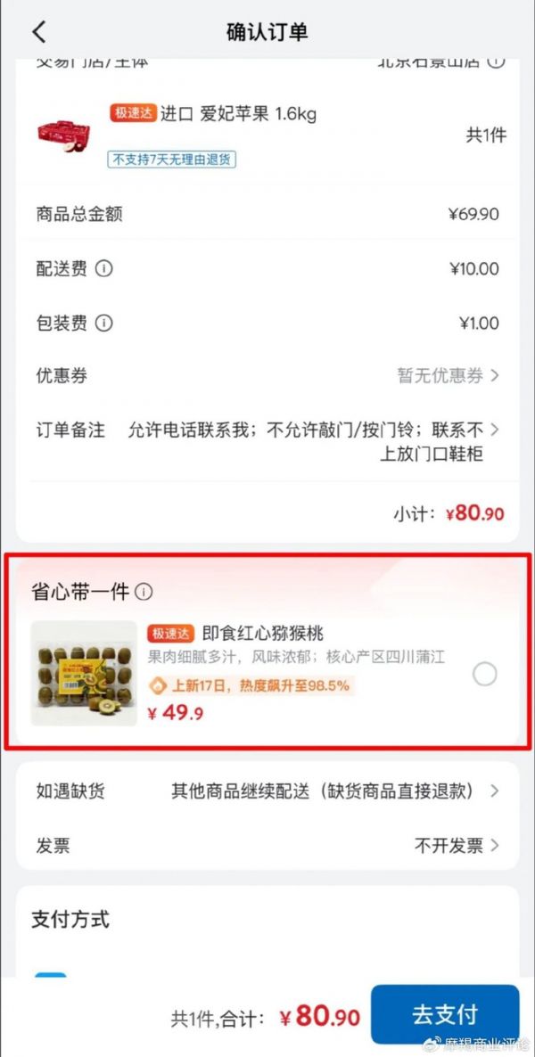 山姆App改版后,很多人都注意到了结算页面下边,出现了“省心带一件”的信息提示框,这可能是“山姆阿里化”最有力的证据了。不过,有不少山姆会员猜测的“相信过不了多久就可以朝山姆借钱“的这种事,至今并未出现。