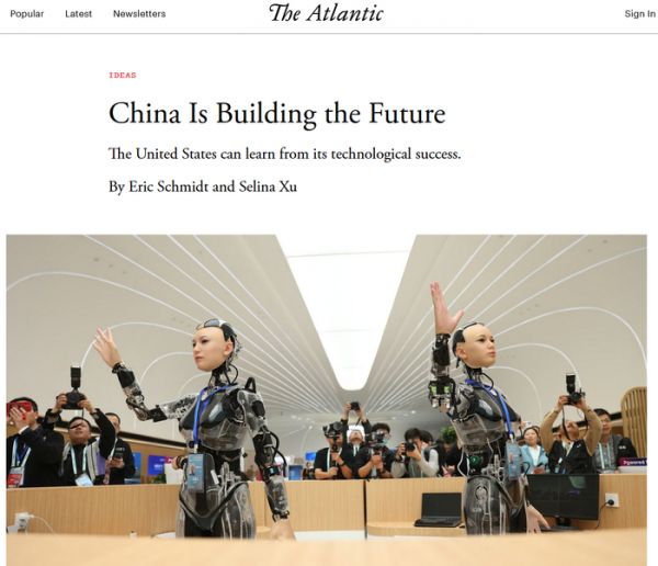 近日,谷歌前CEO施密特等两位作者在《大西洋月刊》撰文称,到访中国的外国人常常体验到中国企业带来的“未来冲击”,他们无不为摩天大楼、高速铁路、宏伟桥梁,以及满大街的电动汽车、功能强大的超级应用和三折屏手机所折服。