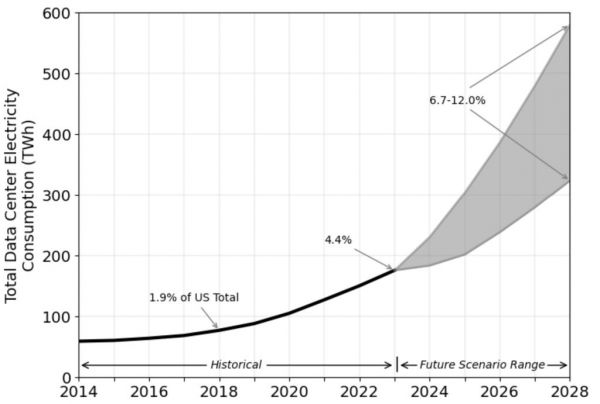 美国能源部 2024 年 12 月发布的一篇报告显示,2023 年,美国数据中心的总耗电量占全国总发电量的 4.4%,达到 176 太瓦时,和马来西亚全国一年总耗电量差不多。到了 2028,这个数字可能会翻倍。