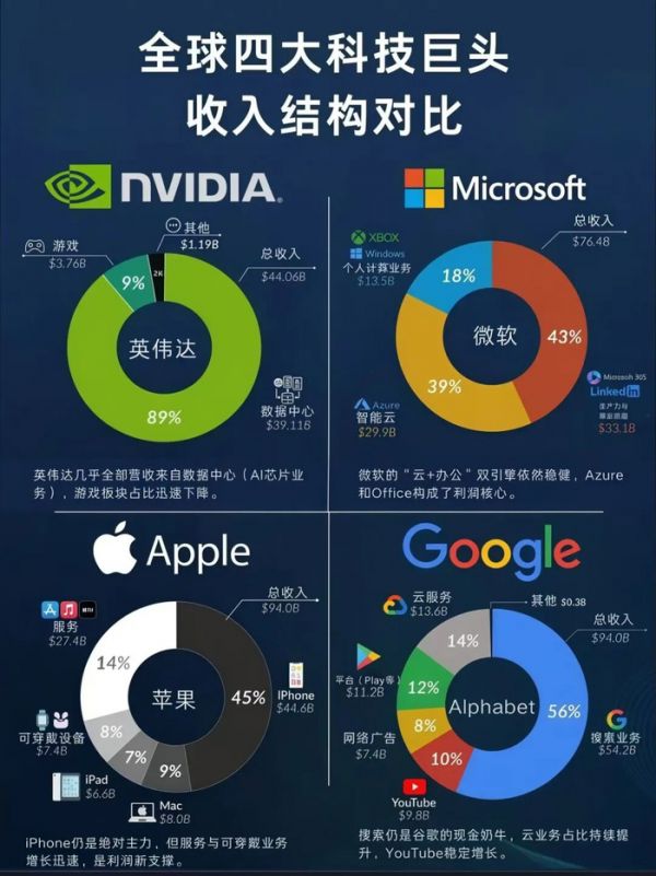 这四家科技巨头的收入结构,其实反映了它们的战略选择。英伟达赌AI的未来,微软要做云时代的办公之王,苹果靠着iPhone生态慢慢转型,谷歌守着搜索的基本盘拓展新业务。