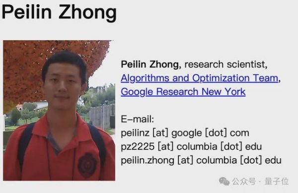 钟沛林,2016年毕业于清华姚班,2021年拿到哥伦比亚大学的计算机博士学位。并且从2021年起,他就加入了谷歌纽约研究院,担任算法与优化团队的科学家。