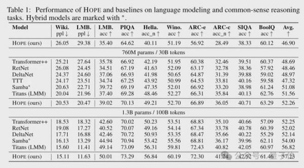 在Wiki文本困惑度、PIQA物理常识推理、Winograd指代消解等多项指标上,Hope要么以更低的困惑度展现出更优的语言建模能力,要么以更高的准确率证明了更强的推理水平。
