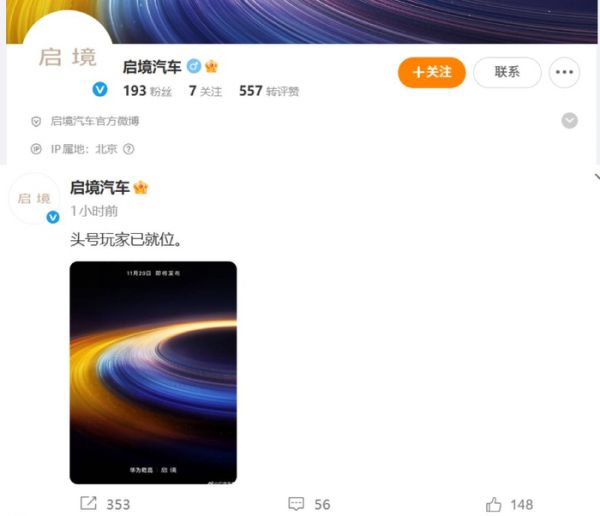 11月14日,一个叫“启境汽车”的新账号突然冒泡,首条内容为“头号玩家已就位”,并附带一张海报,其上明确标注“11月20日即将发布”和“华为乾崑”的字样。