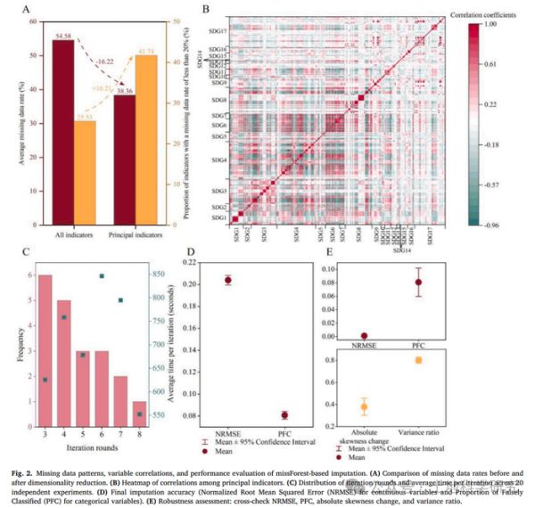 有效监测可持续发展目标(SDGs)对推进全球可持续发展至关重要。然而,普遍存在的数据缺口持续阻碍着对各国及各项目标的准确评估。为应对这一挑战,本研究基于世界银行数据库中2000-2020年期间的380项可持续发展目标指标,开发出融合降维与机器学习插补技术的数据驱动综合评估框架。通过主成分分析(PCA)与多元回归的组合方法筛选核心指标,并采用基于随机森林(RF)的missForest算法填补缺失数据。基于完善后的数据集,评估了2000至2020年间全球215个国家和地区可持续发展目标综合指数及17项具体目标的实施成效。研究结果表明:(1)识别出218项主要指标,覆盖初始数据集90%以上的信息;(2)通过稳健的缺失值填补方法,实现约0.2的归一化均方根误差(NRMSE)和约0.08的错误分类比例(PFC); (3) 全球可持续发展目标绩效呈现稳步提升态势,但存在显著区域差异——欧洲领先,非洲落后,亚洲进步最快;(4) 不同目标间发展不均衡,部分目标面临重大挑战。本研究提升了全球可持续发展目标绩效评估的完整性与适用性,为制定更具针对性的可持续发展政策提供了实证依据。