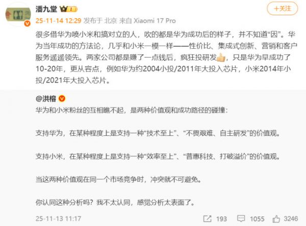 当然,他也大方承认小米还有很多不足,每天都在反思自己哪里不足。要我说,小米、华为都是伟大的科技企业,且各有千秋,目前双方在手机、IoT、汽车等各个领域展开竞争,没必要搞拉踩甚至对立戏码,应该为双方发展创造良好的舆论氛围,彼此为师,助力它们上演高水平的竞争,实现共同进步,从而更好地造福用户、产业甚至社会。你说呢?