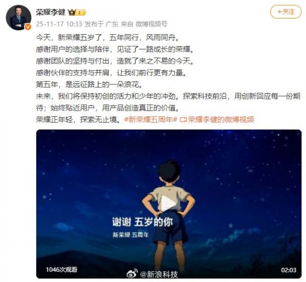 【#荣耀CEO李健发文庆祝新荣耀5周年#】荣耀 CEO @荣耀李健 今日发文庆祝新荣耀 5 周年,并对用户、团队、伙伴表示感谢。