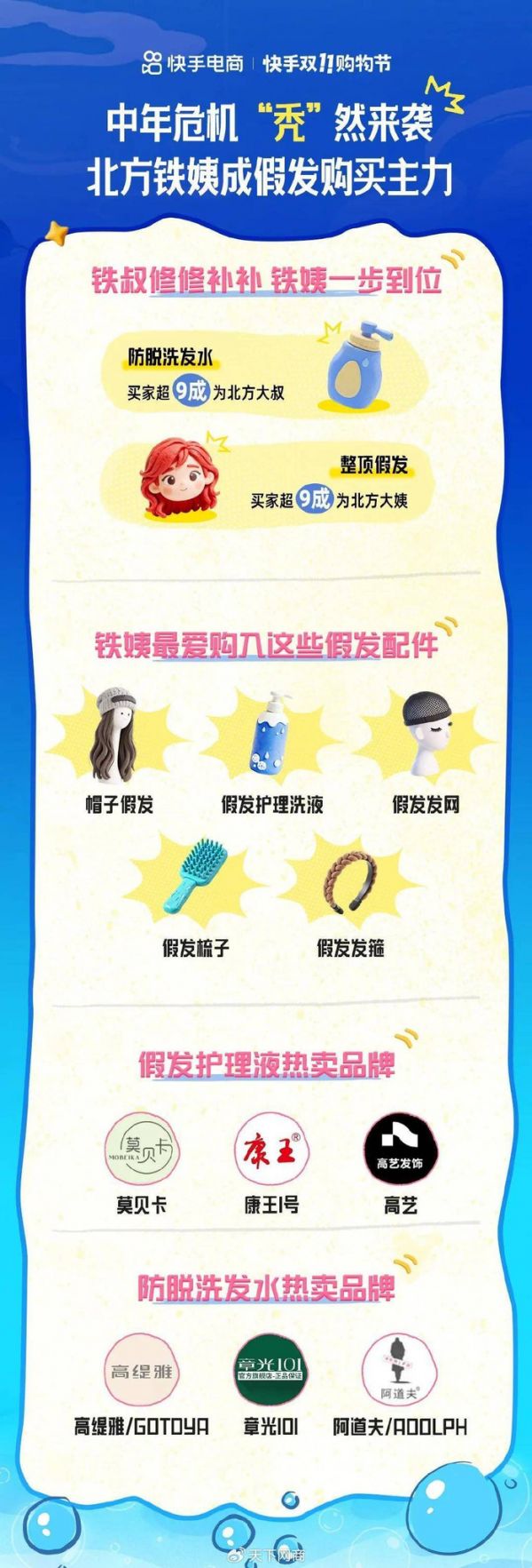 此外,二次元消费、宠物消费升温的同时,中老年群体对颜值管理的重视,也催生了防脱与假发市场的爆发式增长。双十一期间,防脱洗发水买家超9成为北方大叔,而整顶假发的购买者中,北方大姨占比同样超9成,呈现出鲜明的地域与性别特征。