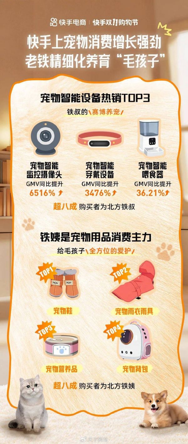 除了二次元消费的爆发,宠物消费的智能化、精细化升级,也带动情感陪伴型消费成为新增长点。快手数据显示,双十一期间宠物智能设备销量暴涨,宠物智能监控摄像头GMV同比提升65倍,宠物智能穿戴设备GMV同比增长35倍,即便是相对成熟的宠物智能喂食器,也实现了36.21%的同比增幅。