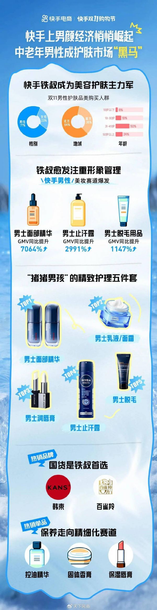 其中,男士护肤赛道的崛起堪称颠覆认知。曾经“男人消费力不如狗”的调侃,在快手双十一数据面前不攻自破:男士面部精华销售额同比暴涨超70倍,止汗露、脱毛产品同比增幅分别近30倍、11倍,其中,31-49岁北方男性贡献超50%以上的消费额,韩束、百雀羚等国货成其首选。这背后,是男性形象管理意识的觉醒,随着社交场景多元化,精致不再是女性专属,快手老铁的分享模式,通过真实用户体验降低了男性消费决策成本,恰好适配其对 实用、高效的需求。