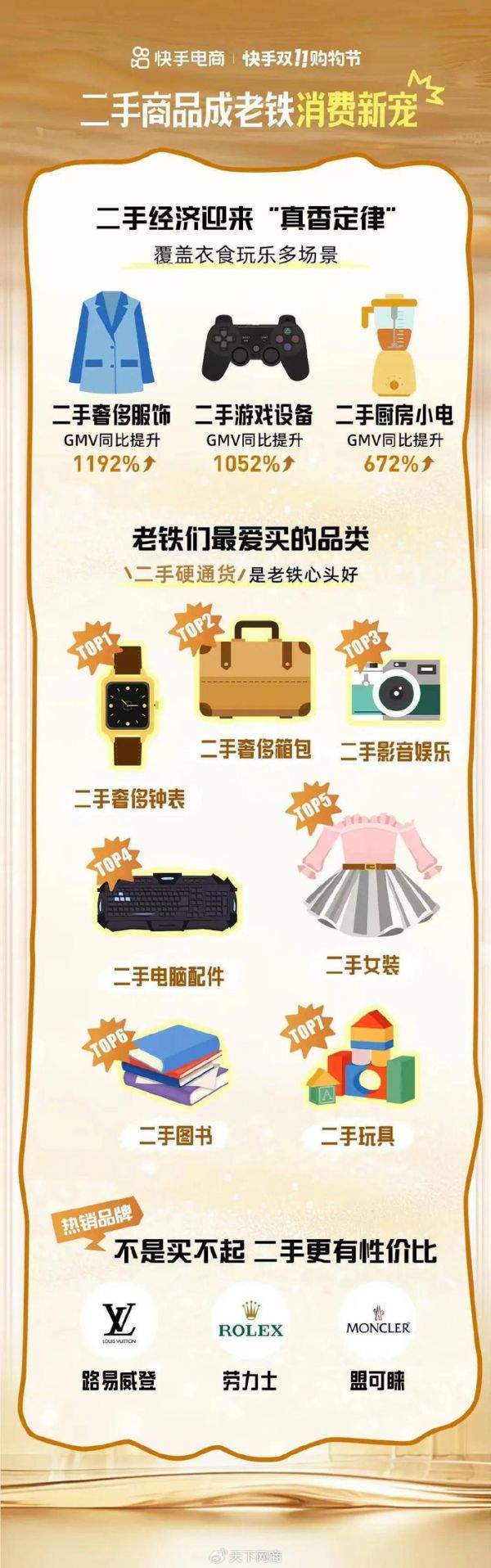 二手经济的爆发则标志着消费理念的升级。双十一期间,快手二手奢侈服饰、二手游戏设备、二手厨房小电GMV同比分别暴涨12倍、11倍、7倍,品类从奢侈品延伸至怀旧课本、玩具等日常场景。更关键的是,二手消费已摆脱捡便宜标签,成为年轻人践行环保、寄托情感的方式。“死去的回忆正在攻击我”,让闲置流转多了层情感共鸣。