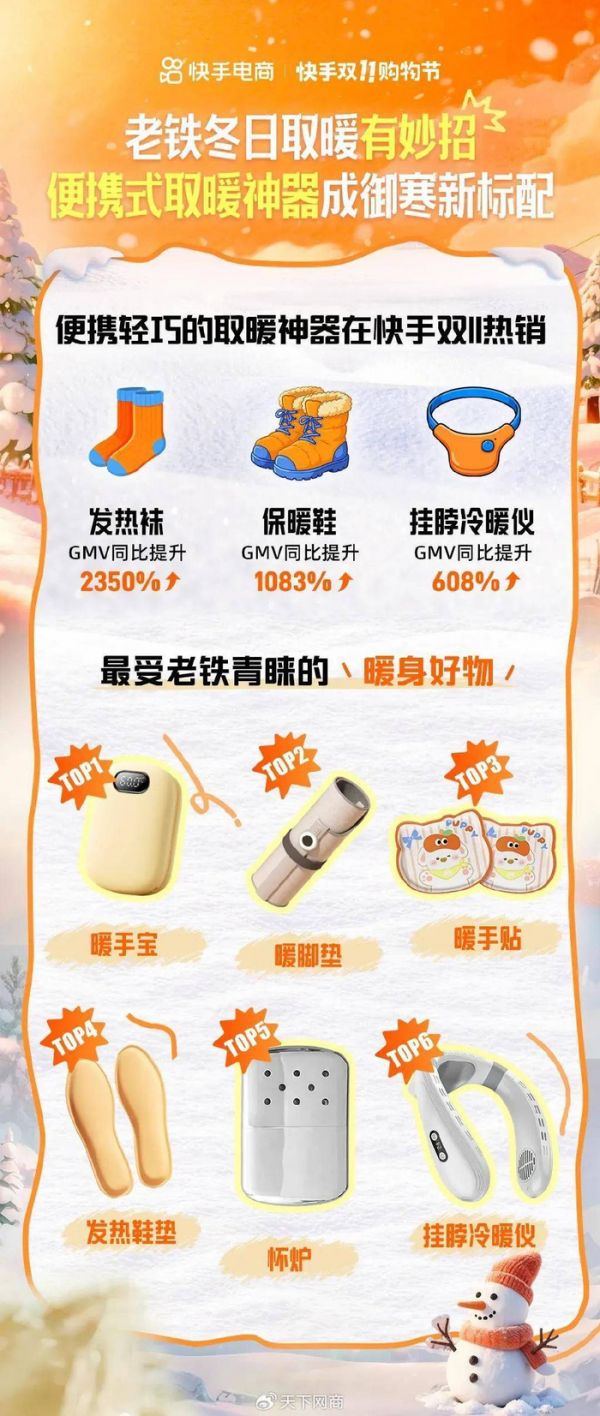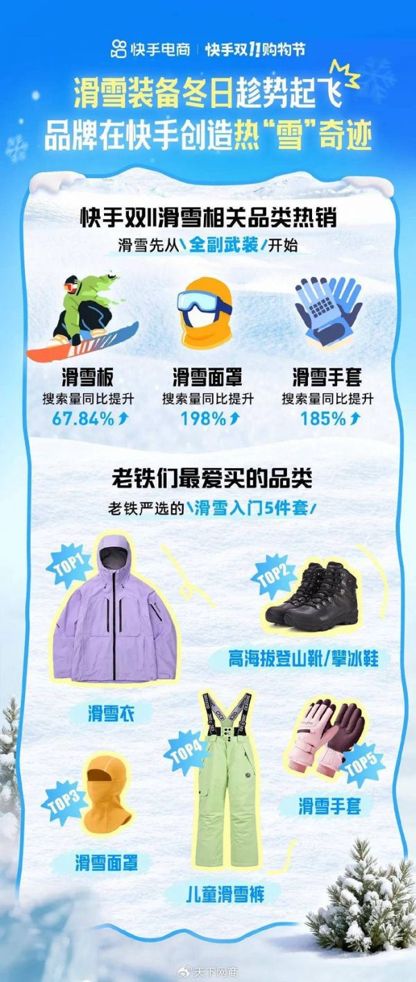 保暖神器与滑雪装备的热销,展现了消费者对健康生活与品质体验的双重追求,季节性消费呈现出“提前布局、精细化升级”的特征。随着天气转冷,快手老铁们的购物清单迅速换季,发热袜GMV同比提升24倍,保暖鞋销售额同比增长11倍,挂脖冷暖仪同比提升6倍,消费者养生观念更注重日常调养与全方位呵护,通过精细化的保暖装备提升生活舒适度。与此同时,新雪季的开启让滑雪相关品类销量暴涨,滑雪裤、面罩、手套等配件也实现大幅增长,儿童滑雪服、滑雪裤等产品的爆发,更凸显了滑雪运动的家庭化趋势。其中,快手平台通过短视频、直播间的场景化展示,让消费者能够直观了解滑雪装备的使用场景与效果,进一步刺激了消费需求。