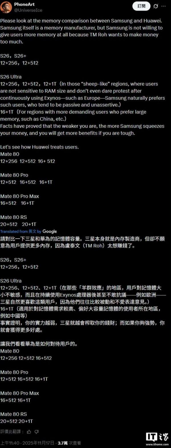 博主还吐槽道,三星本身就生产内存,却不愿意给用户提供更大的内存,卢泰文(三星电子移动体验部门负责人)实在是太想赚钱了。而且这种“区别对待”表明,你的实力越弱小,三星就会想方法榨取(squeezes)你的钱财;但如果你足够强势,那就会获得更多好处。