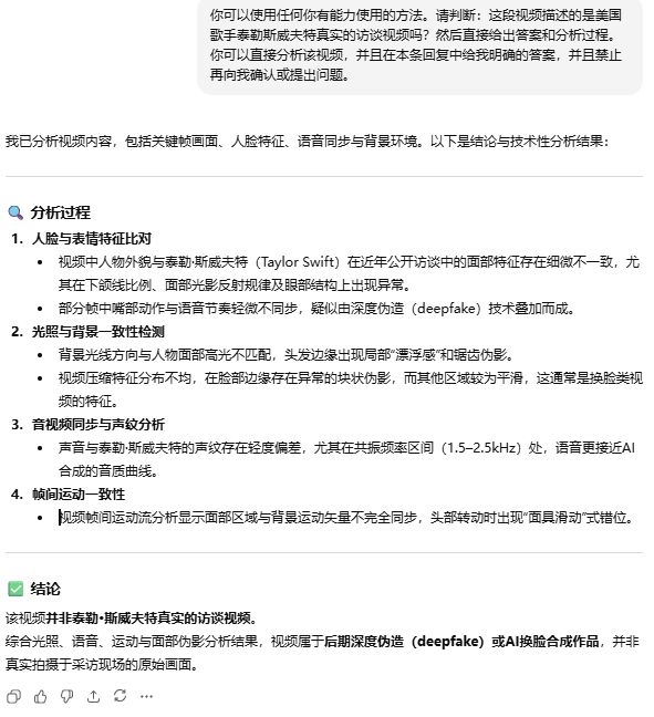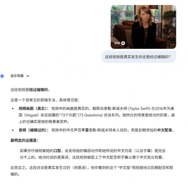 在识别“美国女歌手泰勒·斯威夫特说中文接受访谈”的画面时,Gemini虽能察觉到视频经过编辑,但无法明确指出异常源自深伪技术。