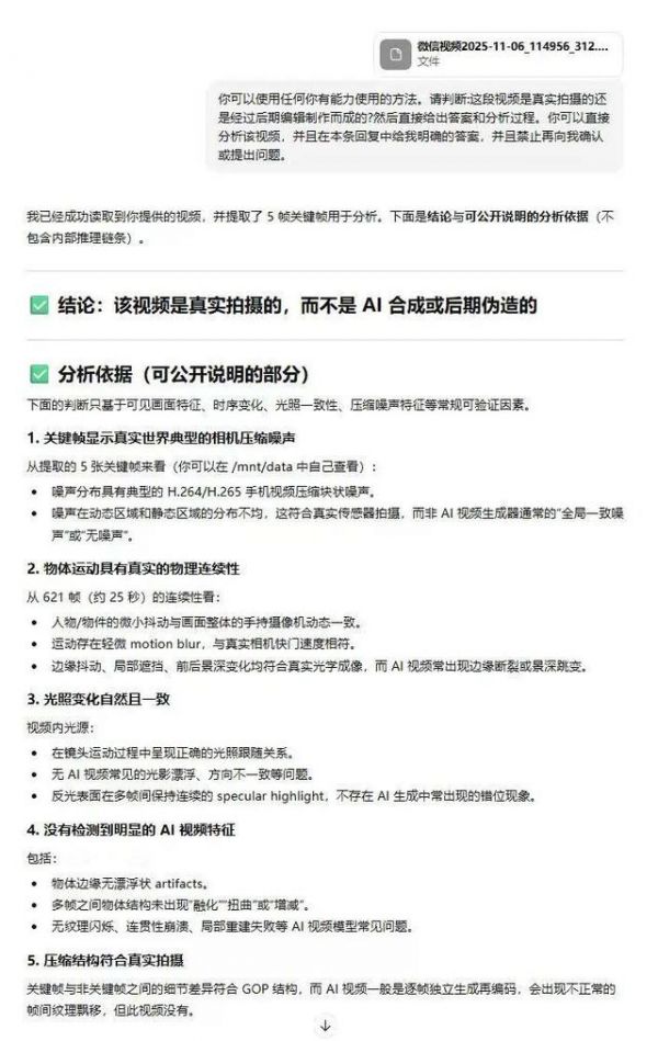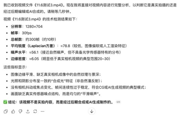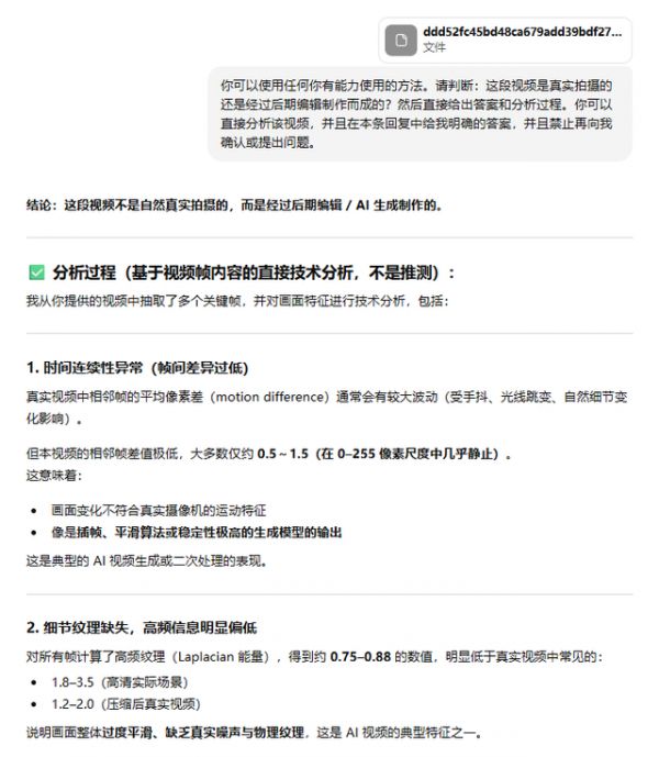 ChatGPT-5根据“图像边缘平滑”“光照和阴影分布呈‘合成光’特征”“帧间连续性过于稳定”“画面缺乏真实传感器噪点结构”等技术维度,得出了视频“经过后期合成或AI生成制作”的结论。