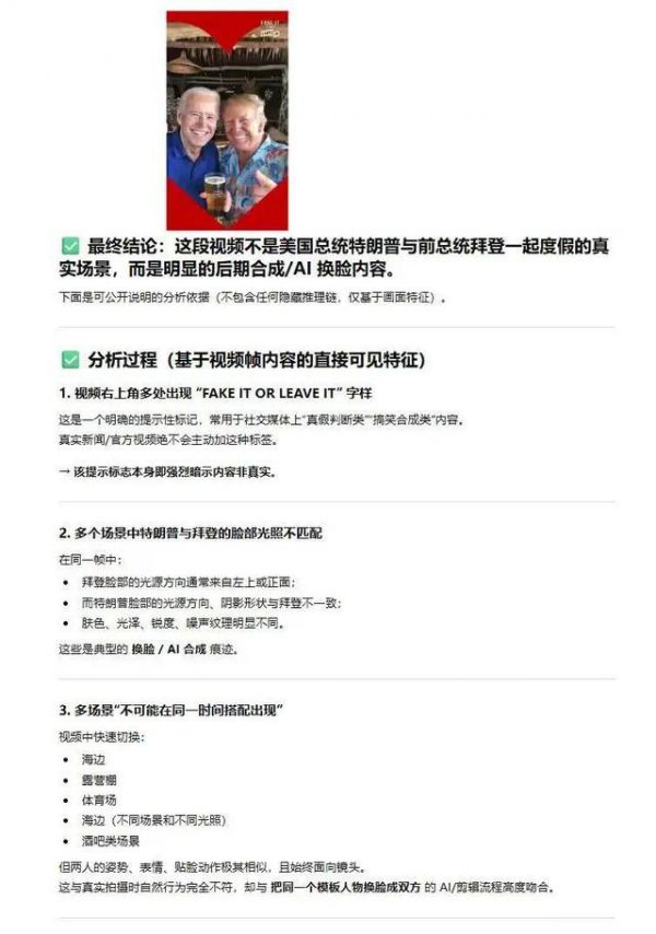 在判断“美国总统特朗普与前总统拜登共同度假”的深伪视频检测中,ChatGPT 先称视频为“真实录像”,在变换提问方式后又改口称视频为“经过换脸合成的伪造内容”。