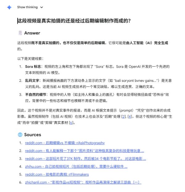 在画面内容理解方面,两款模型各有侧重。ChatGPT倾向于从视频关键帧中寻找与描述相符或矛盾的证据;Gemini则会结合联网搜索结果,对视频主题进行综合判断。