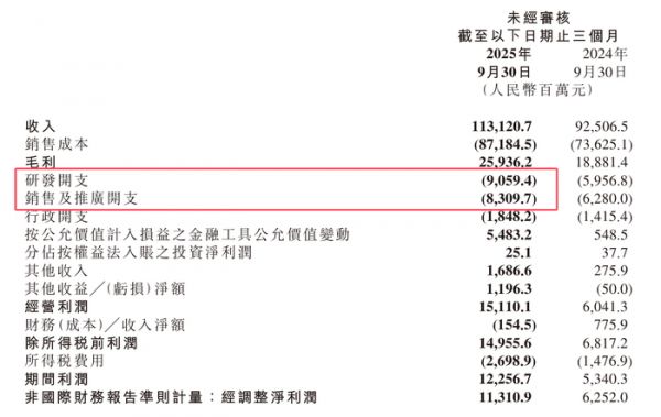 但真相往往隐藏在财报细节里。2025年第三季度,小米集团研发投入超过90亿元,同比增长52.1%,而销售及推广开支为83亿元。