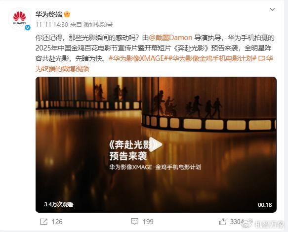 此前,华为终端官方微博于11月11日发布第38届中国金鸡百花电影节宣传短片奔赴光影。该片由本届金鸡奖最佳导演戴墨执导,全程采用最新款华为手机拍摄,以光影叙事致敬中国电影诞生120周年。近日,官方正式宣布第38届中国金鸡百花电影节宣传片暨开幕短片《奔赴光影》是使用华为Mate 80系列完成拍摄的。此次影像作品的公开亮相,也标志着该系列手机在影像性能上的首次全面展示。