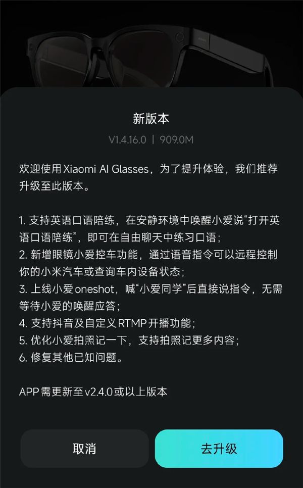 据了解,更新固件的同时还需将小米眼镜App更新至v2.4.0或以上版本。