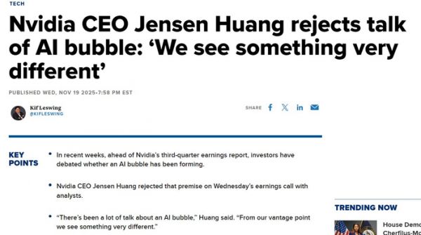 刚刚交出亮眼财报后,黄仁勋在财报电话会上再次驳斥了“AI泡沫论”,觉得从他和公司的角度看不到泡沫存在,并认为“已经进入了AI的良性循环期”。其核心论据如下: