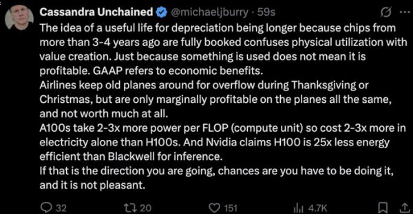 他还指责大型科技公司低估了其人工智能资本支出的折旧,同时驳斥了老旧人工智能芯片仅仅因为仍在继续使用就应该有更长折旧期的观点。