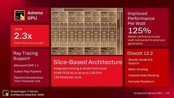 首先为了让 Adreno X2 真正跑得动主流游戏,高通做了大量「非移动 GPU」的重构,除了前文提到的四切片并行架构和 21MB 的高速显存,还支持了 DirectX 12.2 Ultimate 全套功能,包括光追、Mesh Shader、VRS 等。同时考虑到大量老游戏的运行,也针对 DX11 引擎做了特化优化。
