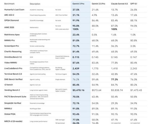 华尔街见闻写道,在多模态处理能力方面,Gemini 3 Pro相比竞争对手建立了显著优势。在MMMU-Pro、ScreenSpot-Pro、Video-MMMU等多模态基准测试中,该模型相比Gemini 2.5 Pro出现明显跳跃式提升,并普遍超越GPT-5.1与Claude 4.5。