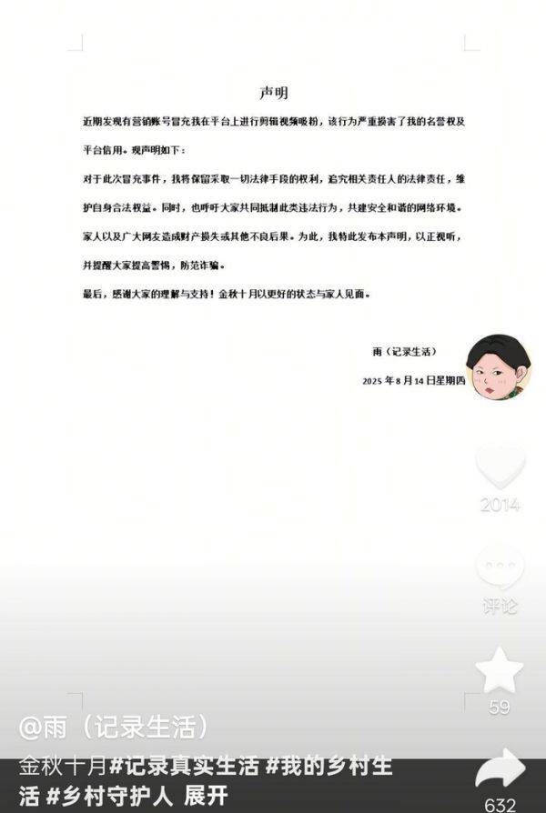 近日,曾因虚假宣传被处罚的大网红“东北雨姐”疑似借助名为“雨(记录生活)”的短视频小号试探性复出,在抖音平台搜索“东北雨姐”小号后,该账号赫然出现,账号主页简介写有“雨姐带大家了解农村日常生活”的字样,账号属地为辽宁省本溪市,其每条视频的发布语均为“雨姐带大家了解东北日常生活,乡村美食”背景音乐是“东北雨姐”之前常使用的《大东北我的家乡》,但该账号大部分视频为做饭画面,偶尔能听到“东北雨姐”的声音,几乎看不到本人的画面,只有通过视频慢放才能捕捉到其不到一秒钟的露脸画面。该账号置顶的一则声明中写道:近期,发现有营销号冒充我在平台进行剪辑视频吸粉,我将保留采取一切法律手段的权利,追究相关责任人的法律责任,感谢大家的理解与支持,金秋十月以更好的状态与家人见面!