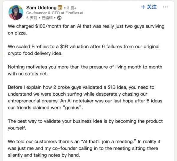 联合创始人兼 CTO Sam Udotong 也喜欢在 LinkedIn 上畅所欲言,他在一篇帖子里毫不避讳地揭开了企业成立早期的秘密:2017 年,他们向客户收取每月 100 美元的费用,宣称提供一个能够“自动加入会议、自动记录笔记”的 AI 助理。