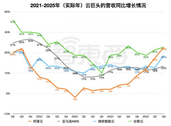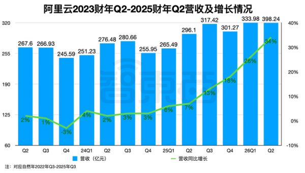 智东西11月25日报道,刚刚,阿里巴巴发布2026财年第二季度(实际年2025年第三季度)财报,该季度阿里云营收达398.24亿元人民币,增速创新高,同比增长达34%。从过去三年的表现来看,这是阿里云收入增速在期间首次超30%。