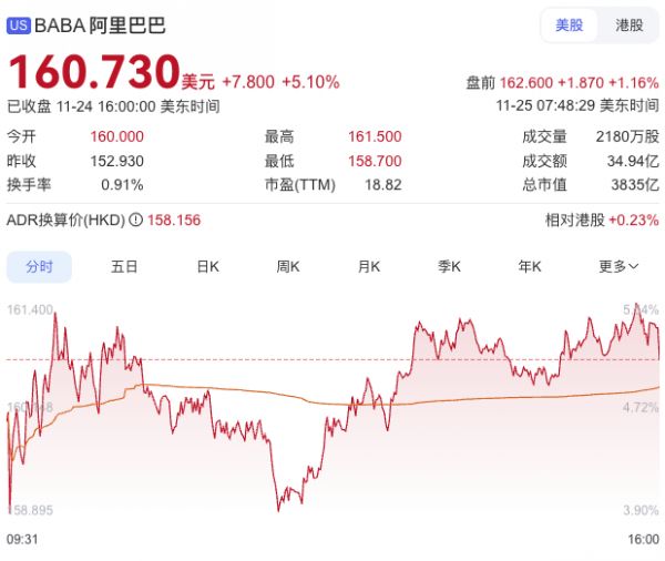 受财报影响,阿里盘前股价上扬达5.1%,报168.5美元。
