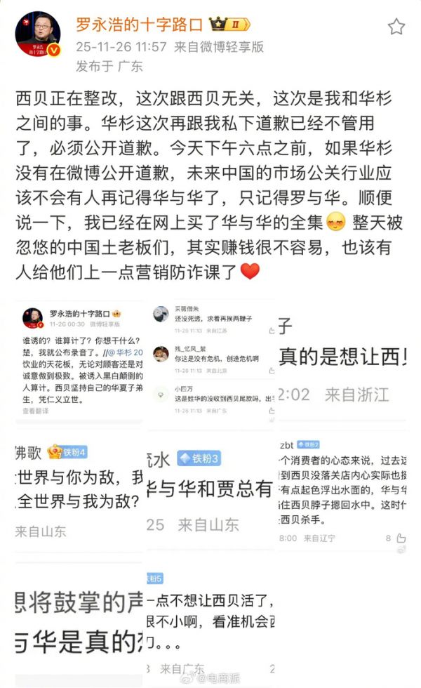 #罗永浩称还会公布录音# 华与华老板未公开道歉,罗永浩最新发声:没有接受私下道歉、没被威胁,还会公布录音。