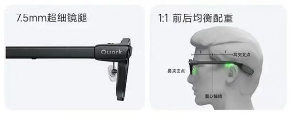 也因为线路了有足够自由度,夸克AI眼镜S1才可以把芯片、电池等核心部件创造性地后置到镜腿的尾部,整机重心被拉成前后约1:1的平衡,戴在脸上稳、不压鼻梁、不往下滑。