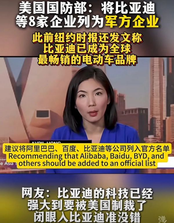 美国防部将阿里比亚迪等8家中企列入清单!网友:一边给中国示好要稀土,一边制裁中国公司,算盘打得响
